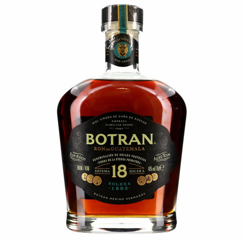 Botran Ron Anejo 18 Solera 1893 is a traditional, first-class rum from Guatemala with an alcohol content of 40%. Matured using the solera method, it is characterized by its rich, complex aromas of caramel, vanilla, raisins and oak. The rum comes in a 0.7 liter bottle and is perfect for lovers of high-quality rum. Enjoy this exquisite rum neat or in cocktails.